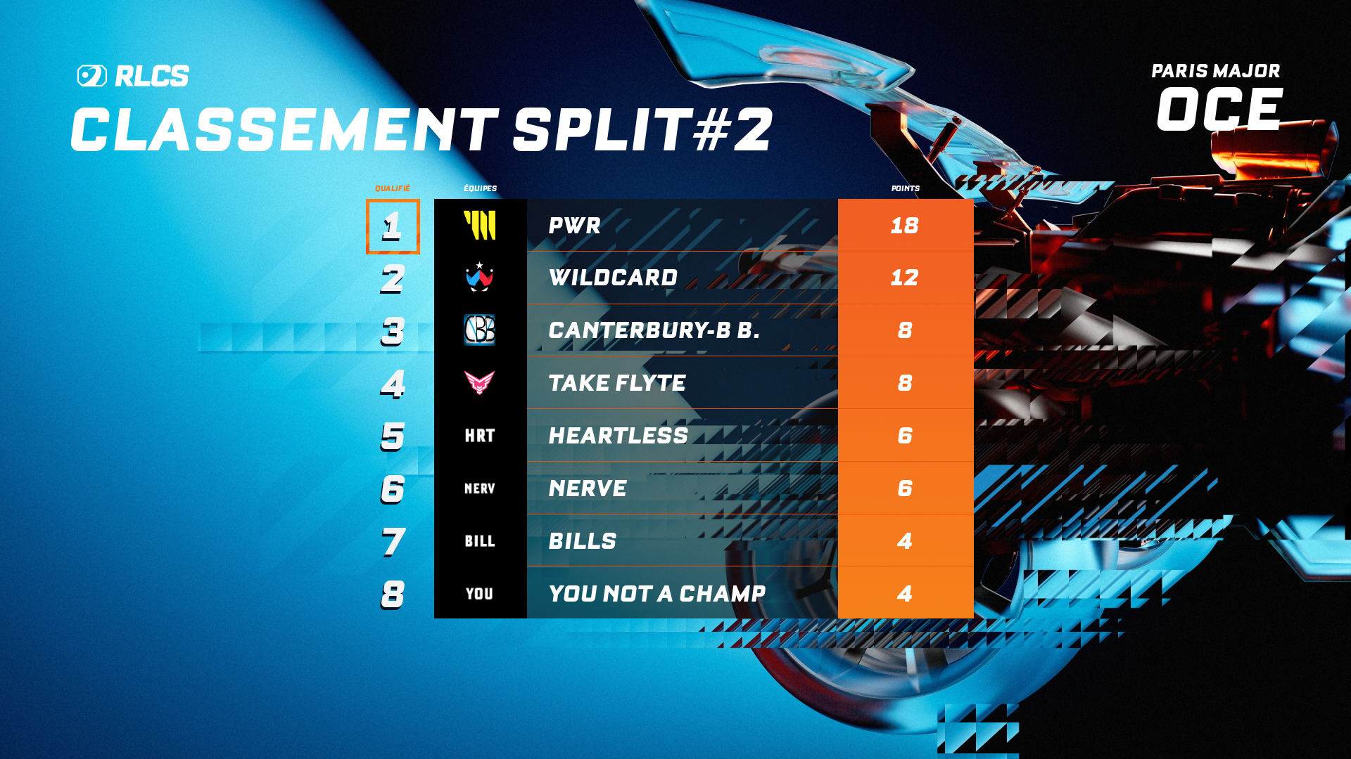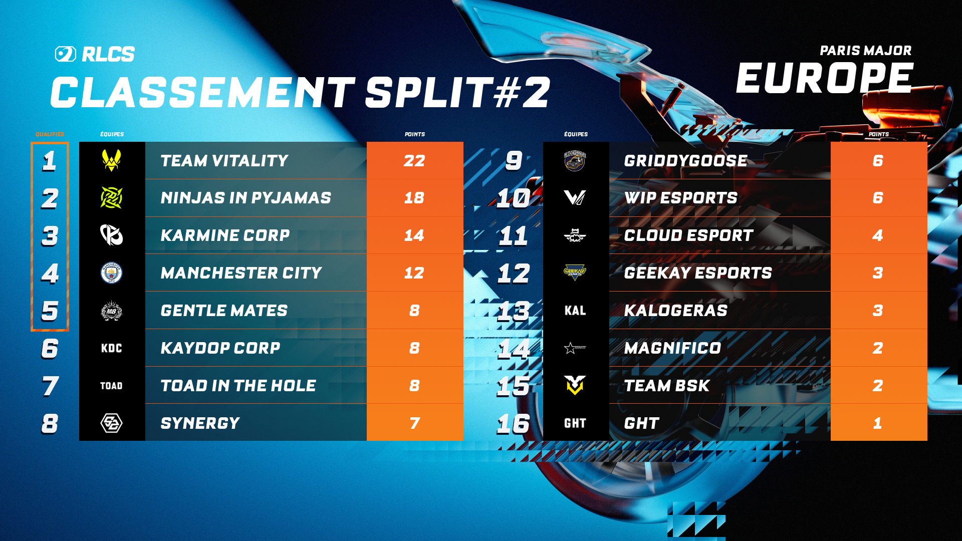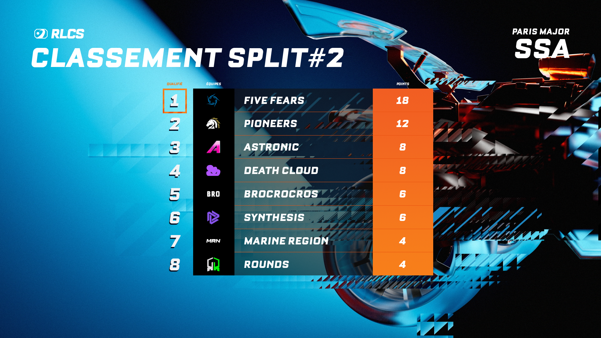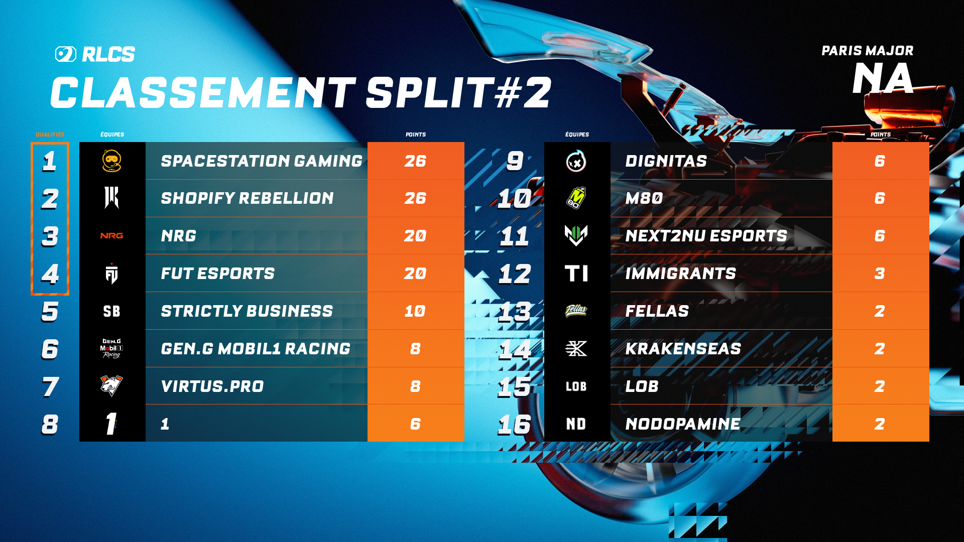 - Les Open Qualifiers rapportent des Points RLCS en fonction des performances. A la fin des trois Opens, les équipes avec le plus de points sont invitées au Major qui conclut le split. Le Major rapporte deux fois plus de points.